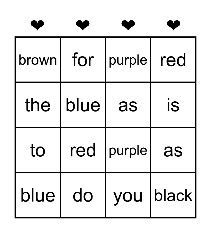 ⚠ This card has duplicate items: a (2), I (2), as (2), see (2), red (2), blue (2), green (2), purple (2), the (2), to (2), black (2), brown (2), do (2)