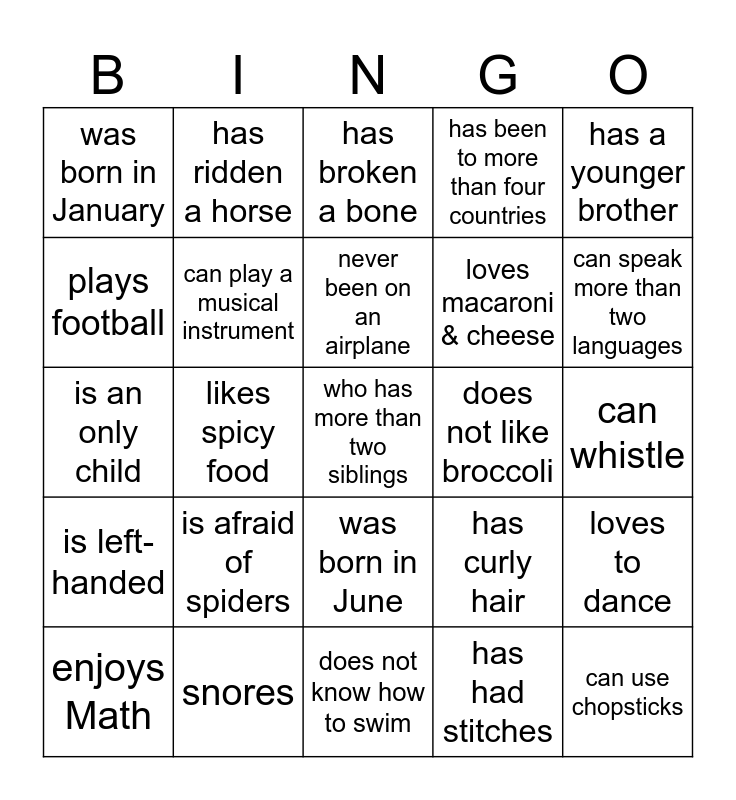 This bingo card has a free space and 29 words: enjoys Math, has more than 3 pets, likes spicy food, does not like basketball, was born in January, has broken a bone, can play a musical instrument, is afraid of spiders, does not like broccoli, snores, can whistle, can use chopsticks, does not know how to swim, has had stitches, can speak more than two languages, has an older sister, was born in June, is left-handed, has a younger brother, is an only child, has curly hair, hates pizza, loves macaroni & cheese, plays football, has been to more than four countries, has ridden a horse, loves to dance, never been on an airplane and was born in February.
