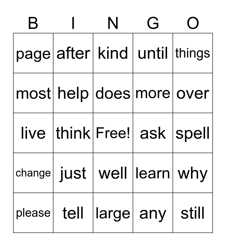 This bingo card has a free space and 40 words: want, live, put, help, tell, well, does, land, things, change, think, until, still, spell, ask, just, place, page, try, kind, why, any, more, most, means, air, years, here, need, eyes, right, please, Earth, learn, over, large, world, work, after and mother.