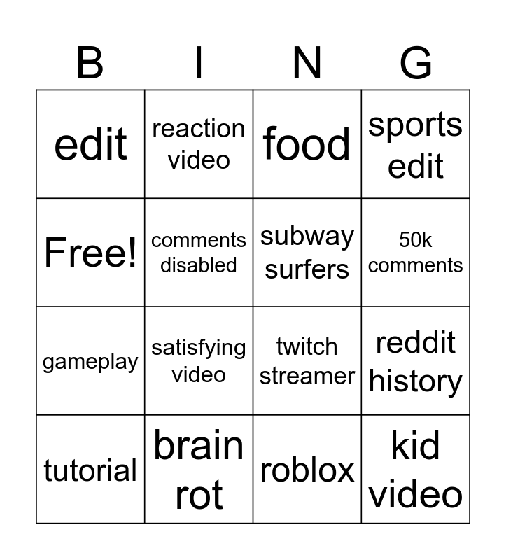 This bingo card has 16 words: brain rot, reddit history, food, edit, gameplay, reaction video, twitch streamer, roblox, Free!, comments disabled, tutorial, sports edit, satisfying video, 50k comments, subway surfers and kid video.