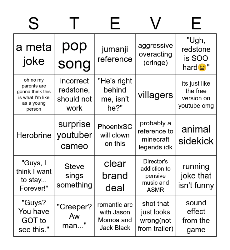 This bingo card has a free space and 24 words: Steve sings something, "Creeper? Aw man...", "He's right behind me, isn't he?", "Guys? You have GOT to see this.", "Ugh, redstone is SOO hard😫", a meta joke, oh no my parents are gonna think this is what I'm like as a young person, pop song, probably a reference to minecraft legends idk, clear brand deal, villagers, Herobrine, Director's addiction to pensive music and ASMR, running joke that isn't funny, incorrect redstone, should not work, shot that just looks wrong(not from trailer), animal sidekick, jumanji reference, its just like the free version on youtube omg, surprise youtuber cameo, sound effect from the game, "Guys, I think I want to stay... Forever!", aggressive overacting (cringe) and romantic arc with Jason Momoa and Jack Black.