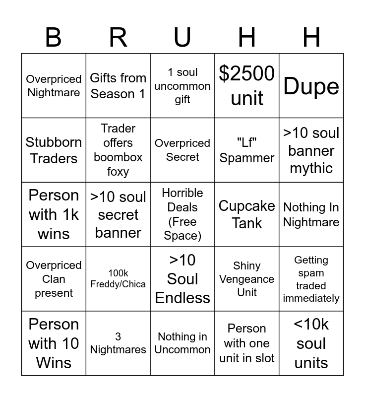 This bingo card has a free space and 24 words: 100k Freddy/Chica, 3 Nightmares, Overpriced Secret, Person with 10 Wins, Dupe, Overpriced Nightmare, Stubborn Traders, Gifts from Season 1, Cupcake Tank, >10 Soul Endless, "Lf" Spammer, Person with 1k wins, Shiny Vengeance Unit, Getting spam traded immediately, Trader offers boombox foxy, Person with one unit in slot, Nothing In Nightmare, 1 soul uncommon gift, >10 soul banner mythic, >10 soul secret banner, <10k soul units, Overpriced Clan present, $2500 unit and Nothing in Uncommon.