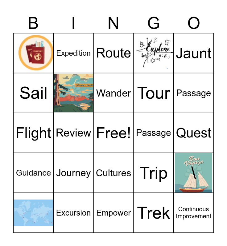 This bingo card has 5 images, a free space and 20 words: Journey, Excursion, Wander, Jaunt, Sail, Expedition, Passage, Cultures, Tour, Flight, Trip, \, Trek, Quest, Route, Passage, Review, Continuous Improvement, Guidance and Empower.