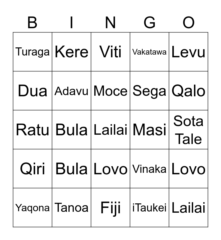 This bingo card has a free space and 24 words: Bula, Tanoa, Moce, Yaqona, Levu, Turaga, Dua, Kere, Masi, Lovo, Sega, Ratu, Vinaka, Lovo, Adavu, iTaukei, Sota Tale, Viti, Qalo, Bula, Lailai, Qiri, Vakatawa and Fiji.