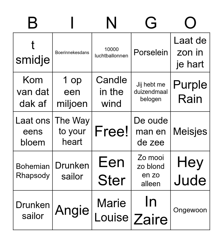 This bingo card has a free space and 125 words: Houten kop, Seven horses in the sky, Sweet Caroline, Beat it, La bamba, De wereld draait voor jou, Bohemian Rhapsody, Laat het gras maar groeien, In Zaire, De oude man en de zee, Kom van dat dak af, pastorale, Pretty Woman, Rasputin, Daar gaat ze, De soep is aangebrand, Angie, Een Ster, Annabel, Meisjes, YMCA, Laat ons eens bloem, Mooie Dagen, Leef, Zeg eens meisje, Candle in the wind, Porselein, The Best, De roos, Als de nacht verdwijnt, Hey Jude, 't is weer voorbij die mooie zomer, The Way to your heart, Drunken sailor, 1 op een miljoen, Heb je even voor mij, Lego House, ik wil deze nacht in de straten verdwalen, Lieve Jacoba, Katleentje, t smidje, Summer of 69, Ik hou van u, Samsonrock, 10000 luchtballonnen, Marie Louise, enamorada, Laat de zon in je hart, Hittentit, Ongewoon, Houten kop, Seven horses in the sky, Sweet Caroline, Beat it, La bamba, De wereld draait voor jou, Bohemian Rhapsody, Laat het gras maar groeien, In Zaire, De oude man en de zee, Kom van dat dak af, pastorale, Pretty Woman, Rasputin, Daar gaat ze, De soep is aangebrand, Angie, Een Ster, Annabel, Meisjes, YMCA, Laat ons eens bloem, Mooie Dagen, Leef, Zeg eens meisje, Candle in the wind, Porselein, The Best, De roos, Als de nacht verdwijnt, Hey Jude, 't is weer voorbij die mooie zomer, The Way to your heart, Drunken sailor, 1 op een miljoen, Heb je even voor mij, Lego House, ik wil deze nacht in de straten verdwalen, Lieve Jacoba, Katleentje, t smidje, Summer of 69, Ik hou van u, Samsonrock, 10000 luchtballonnen, Marie Louise, enamorada, Laat de zon in je hart, Hittentit, Ongewoon, Ik spring uit een vliegmachien, Zo mooi zo blond en zo alleen, Eenzaam zonder jou, Pour un flirt, Dos Cervezas, Take me home country roads, Vlinder, Purple Rain, Les lacs dus connemara, Tim, Marina, Staying Alive, Veel te mooi, Jolene, Suspicious minds, Hucklebuck, Chiquitita, Dancing in the dark, I lie and I cheat, Jij hebt me duizendmaal belogen, J'aime La vie, Du, Let's twist again, Boerinnekesdans and Mamma Mia.