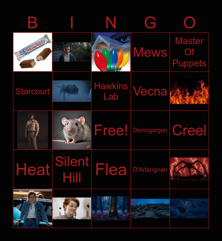 This bingo card has 16 images, a free space and 11 words: D'Artangnan, Vecna, Starcourt, Heat, Demogorgon, Mews, Hawkins Lab, Silent Hill, Creel, Flea and Master Of Puppets.