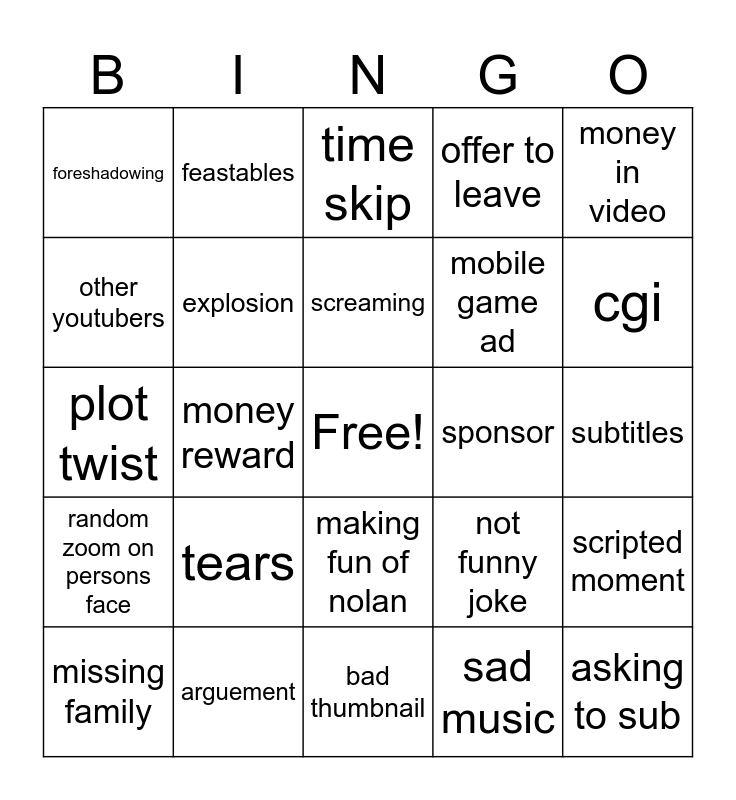 This bingo card has a free space and 24 words: tears, arguement, screaming, missing family, money in video, foreshadowing, other youtubers, feastables, sponsor, making fun of nolan, mobile game ad, plot twist, not funny joke, scripted moment, explosion, sad music, subtitles, time skip, cgi, money reward, asking to sub, random zoom on persons face, offer to leave and bad thumbnail.