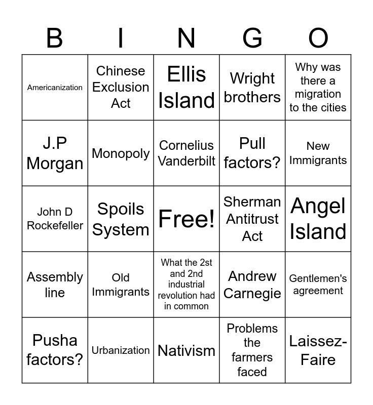 This bingo card has a free space and 30 words: Urbanization, Quota, Spoils System, The strongest will survive, Americanization, Ellis Island, Monopoly, What the 2st and 2nd industrial revolution had in common, Sherman Antitrust Act, Nativism, Angel Island, Laissez-Faire, Problems the farmers faced, Henry Ford, New Immigrants, Problems with urbanization, Andrew Carnegie, Assembly line, Old Immigrants, Why was there a migration to the cities, John D Rockefeller, Thomas Edison and Lewis Howard Latimer, Chinese Exclusion Act, Pull factors?, J.P Morgan, Wright brothers, Gentlemen's agreement, Pusha factors?, Cornelius Vanderbilt and Alexander Graham Bell.