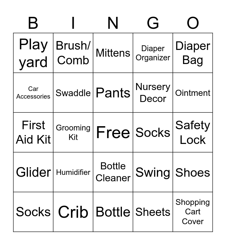This bingo card has a free space and 61 words: Changing Mat, Crib, Crib Mattress, Glider, Sheets, Blanket, Swaddle, Mattress Pad, Nursery Decor, Crib Mobile, Diaper Organizer, White Noise Machine, Car Accessories, Car Seat Protector, Stroller/ Travel System, Play yard, Shopping Cart Cover, Diaper Bag, Onesie, Pants, Socks, Mittens, Socks, Shoes, Diaper Pail, Diaper Pail Refill, Diaper, Wipe, Ointment, Towel, Washcloth, Shampoo, Body Wash, Lotion, Brush/ Comb, Bath Toy, Baby Monitor, Grooming Kit, Nasal Aspirator, First Aid Kit, Thermometer, Humidifier, Safety Lock, Gentle Detergent, Swing, Bouncer, Activity Mat, Stuffed Animal, Book, Bottle Cleaner, Bottle, Pacifier, Keepsake, High Chair, Rattle, Teether, Carrier, Sterilizer, Pajama, Picture Frame and Hat.