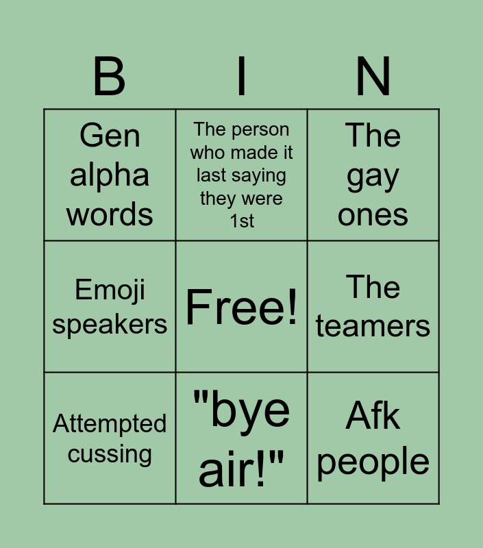 This bingo card has a free space and 8 words: The teamers, The gay ones, The person who made it last saying they were 1st, Attempted cussing, Gen alpha words, Afk people, Emoji speakers and "bye air!".