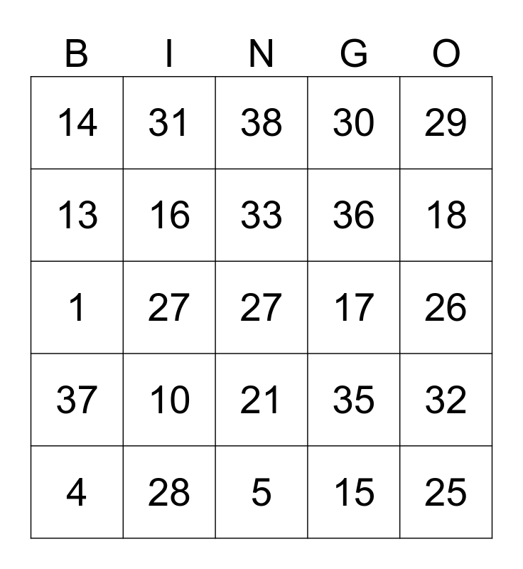 This bingo card has a free space and 29 words: 4, 39, 27, 9, 14, 38, 16, 10, 17, 28, 26, 25, 5, 15, 18, 8, 21, 37, 29, 1, 35, 22, 36, 13, 30, 31, 32, 33 and 34.