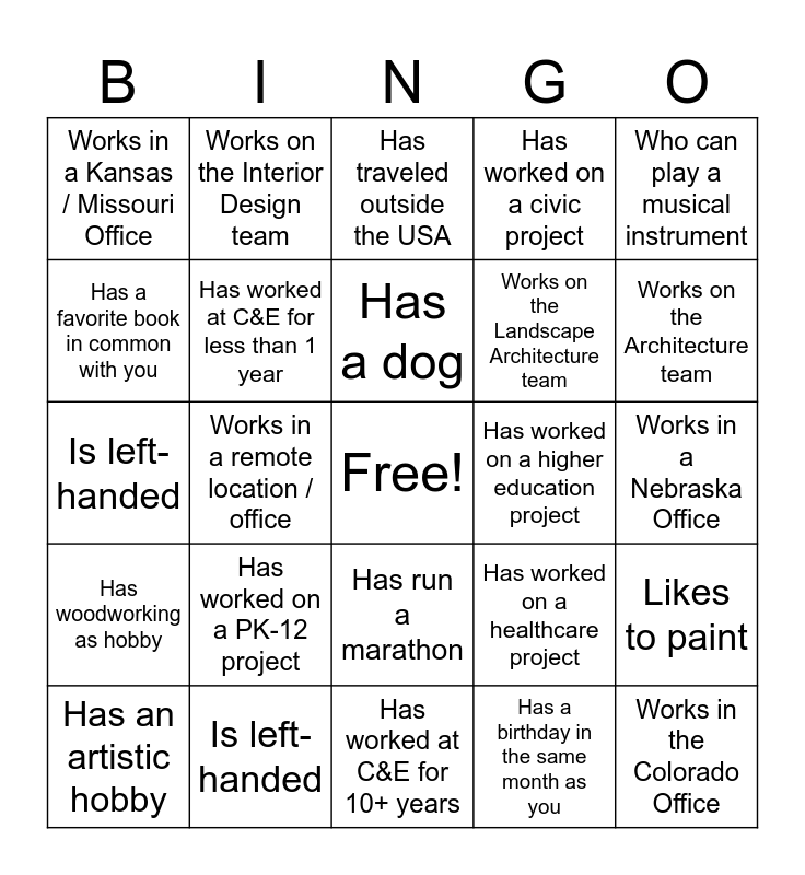 This bingo card has a free space and 24 words: Has worked on a PK-12 project, Is left-handed, Has a dog, Has an artistic hobby, Who can play a musical instrument, Works in a Kansas / Missouri Office, Has a favorite book in common with you, Works on the Interior Design team, Has worked on a higher education project, Has run a marathon, Works on the Landscape Architecture team, Is left-handed, Has worked on a healthcare project, Likes to paint, Has worked at C&E for less than 1 year, Has a birthday in the same month as you, Works in a Nebraska Office, Has traveled outside the USA, Works on the Architecture team, Works in a remote location / office, Works in the Colorado Office, Has woodworking as hobby, Has worked on a civic project and Has worked at C&E for 10+ years.