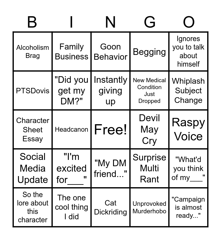 This bingo card has a free space and 24 words: "I'm excited for___", The one cool thing I did, Instantly giving up, So the lore about this character, Ignores you to talk about himself, Alcoholism Brag, PTSDovis, Family Business, Devil May Cry, "My DM friend...", New Medical Condition Just Dropped, Character Sheet Essay, Surprise Multi Rant, "What'd you think of my___", "Did you get my DM?", Unprovoked Murderhobo, Raspy Voice, Goon Behavior, Whiplash Subject Change, Headcanon, "Campaign is almost ready...", Social Media Update, Begging and Cat Dickriding.