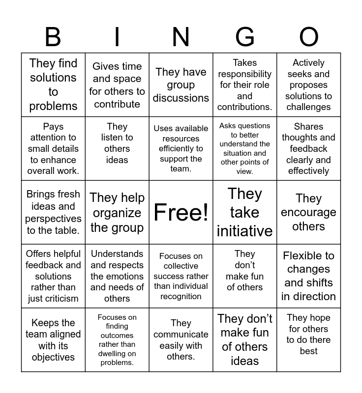 This bingo card has a free space and 31 words: They communicate easily with others., They discuss common goals with others, They help organize the group, They brainstorm ideas, They find solutions to problems, They have group discussions, They listen to others ideas, They don’t make fun of others, They take initiative, They don’t make fun of others ideas, They encourage others, They hope for others to do there best, Willing to consider new ideas and perspectives, Focuses on understanding others' viewpoints, Shares thoughts and feedback clearly and effectively, Delivers on commitments and meets deadlines, Flexible to changes and shifts in direction, Understands and respects the emotions and needs of others, Offers helpful feedback and solutions rather than just criticism, Focuses on collective success rather than individual recognition, Actively seeks and proposes solutions to challenges, Takes initiative and anticipates needs without being asked, Keeps the team aligned with its objectives, Gives time and space for others to contribute, Asks questions to better understand the situation and other points of view., Pays attention to small details to enhance overall work., Takes responsibility for their role and contributions., Brings fresh ideas and perspectives to the table., Focuses on finding outcomes rather than dwelling on problems., Uses available resources efficiently to support the team. and Maintains a can-do approach, even in challenging situations.