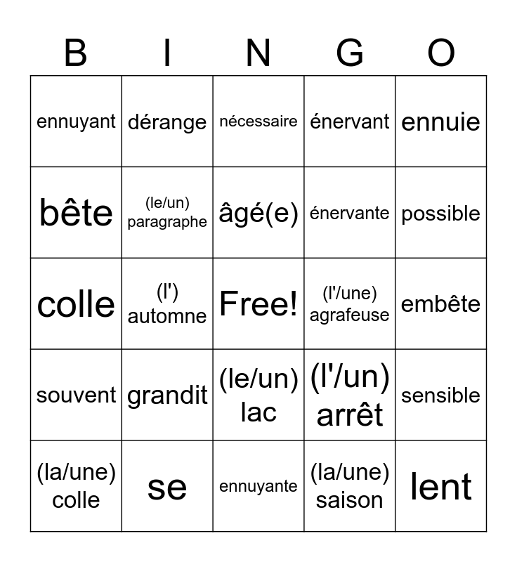 This bingo card has a free space and 32 words: (la/une) saison, (le) printemps, (l') automne, (l') hiver, souvent, (le/un) paragraphe, ennuie, sensible, dérange, doué(e), âgé(e), nécessaire, terrible, devine, (l'/une) agrafeuse, agrafe, (la/une) colle, colle, (le/un) lac, grandit, (l'/un) arrêt, (la/une) salle de bains, embête, se, lent, énervant, énervante, bête, ennuyant, ennuyante, cadeau and possible.