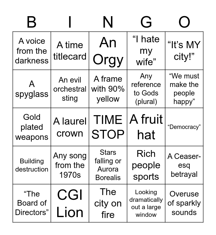 This bingo card has a free space and 24 words: Any song from the 1970s, CGI Lion, A frame with 90% yellow, “The Board of Directors”, “It’s MY city!”, A voice from the darkness, A spyglass, A time titlecard, A fruit hat, Stars falling or Aurora Borealis, Any reference to Gods (plural), Gold plated weapons, Rich people sports, A Ceaser-esq betrayal, An evil orchestral sting, Looking dramatically out a large window, “Democracy”, An Orgy, “We must make the people happy”, A laurel crown, Overuse of sparkly sounds, Building destruction, “I hate my wife” and The city on fire.