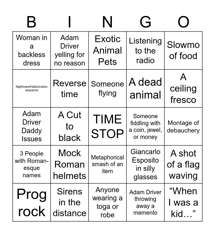 This bingo card has a free space and 24 words: Mock Roman helmets, Sirens in the distance, Someone flying, Prog rock, Slowmo of food, Woman in a backless dress, Nightmare/Hallucination sequence, Adam Driver yelling for no reason, Someone fiddling with a coin, jewel, or money, Metaphorical smash of an item, A dead animal, Adam Driver Daddy Issues, Giancarlo Esposito in silly glasses, A shot of a flag waving, Reverse time, Adam Driver throwing away a memento, Montage of debauchery, Exotic Animal Pets, A ceiling fresco, A Cut to black, “When I was a kid…”, 3 People with Roman-esque names, Listening to the radio and Anyone wearing a toga or robe.
