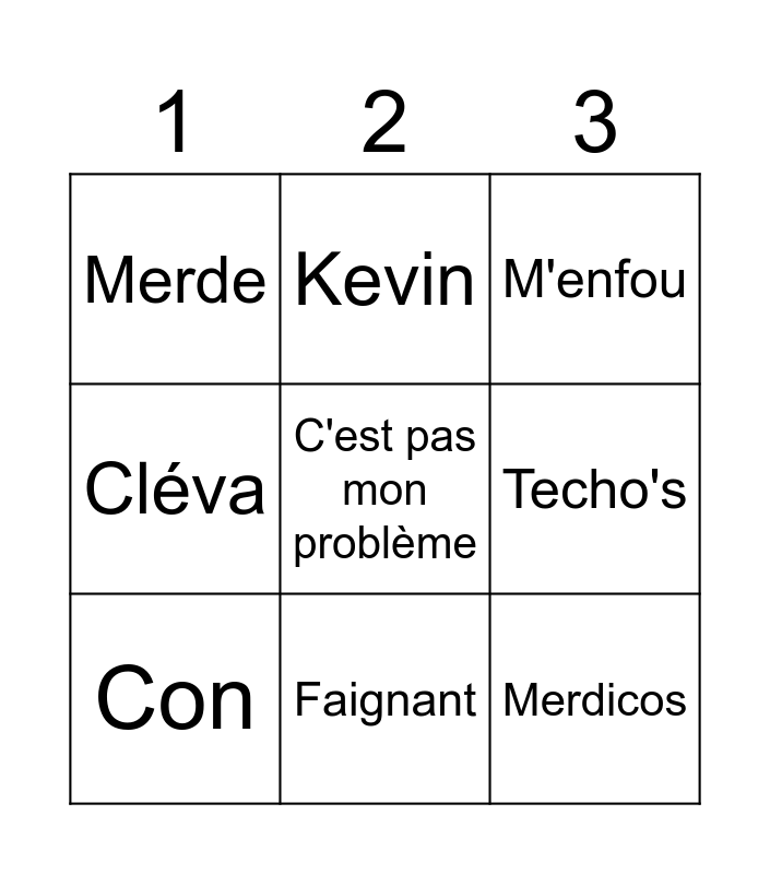 This bingo card has 9 words: Con, M'enfou, Kevin, Cléva, Merde, Techo's, C'est pas mon problème, Merdicos and Faignant.