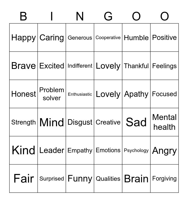 This bingo card has 36 words: Emotions, Empathy, Qualities, Brave, Strength, Lovely, Excited, Funny, Humble, Psychology, Feelings, Cooperative, Angry, Problem solver, Lovely, Happy, Kind, Apathy, Honest, Generous, Enthusiastic, Mind, Creative, Disgust, Sad, Caring, Thankful, Surprised, Indifferent, Positive, Forgiving, Fair, Mental health, Focused, Leader and Brain.