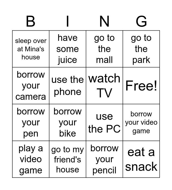 This bingo card has 18 words: borrow your bike, eat a snack, go to the mall, sleep over at Mina's house, use the PC, go to the park, play a video game, have some juice, Free!, borrow your pen, borrow your pencil, borrow your camera, borrow your video game, use the phone, watch TV, go home, go to my friend's house and read some comic books.