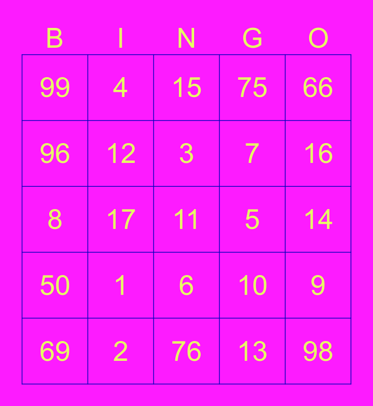 This bingo card has a free space and 24 words: 1, 2, 3, 69, 66, 99, 96, 4, 5, 6, 7, 8, 10, 9, 12, 13, 14, 15, 16, 17, 98, 50, 75 and 76.