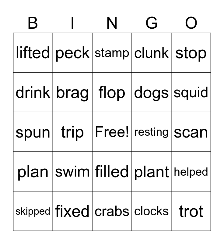 This bingo card has a free space and 29 words: skipped, song, trip, went, lifted, stamp, brag, swim, resting, fixed, scan, trot, crabs, clocks, squid, clang, filled, plan, stop, spun, plant, yelp, dogs, drink, clunk, peck, helped, flop and grand.