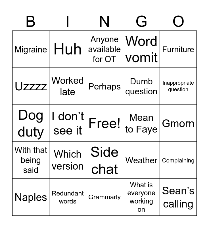 This bingo card has a free space and 24 words: Which version, Redundant words, Perhaps, Naples, Furniture, Migraine, Uzzzz, Huh, Mean to Faye, Side chat, Dumb question, Dog duty, Weather, Complaining, Worked late, What is everyone working on, Gmorn, Anyone available for OT, Inappropriate question, I don’t see it, Sean’s calling, With that being said, Word vomit and Grammarly.
