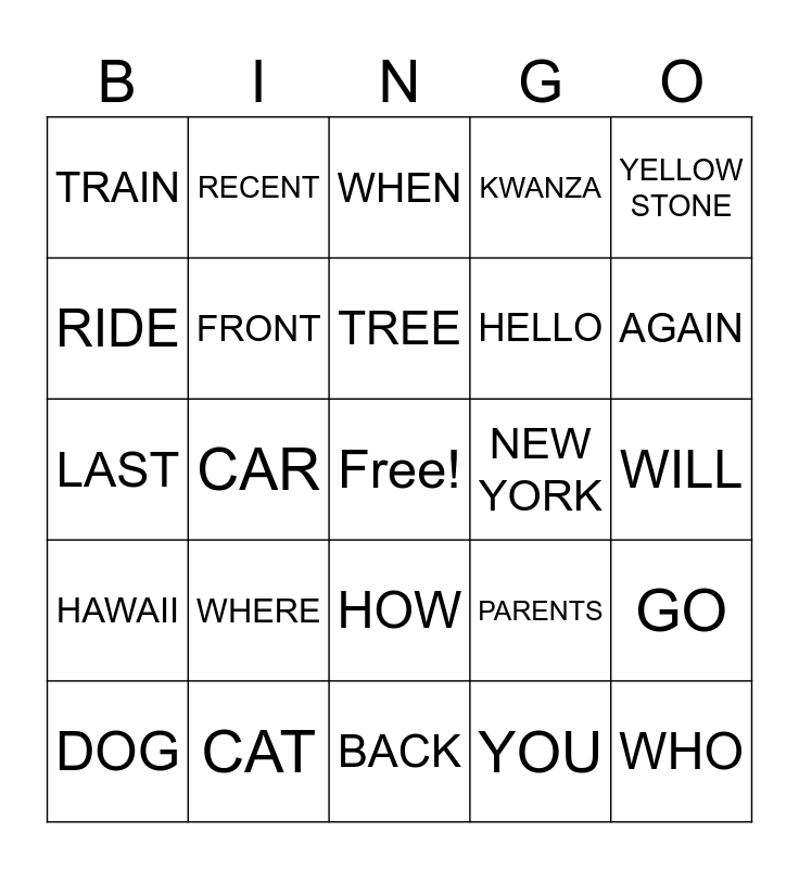 This bingo card has a free space and 42 words: ANIMAL, TREE, PARK, WHERE, YOU, GO, WHO, WITH, WHEN, HOW, WILL, AGAIN, CAR, YELLOW STONE, WENT, PARENTS, SISTER, LAST, SUMMER, RECENT, RIDE, COUNTRY, AIRPLANE, TRAIN, BROTHER, WHAT, HELLO, SHE/HE/IT, BYE, YOUR, THANK YOU, HAWAII, FRONT, BACK, FISH, DOG, CAT, NEW YORK, CHRISTMAS, EASTER, KWANZA and HANUKKAH.