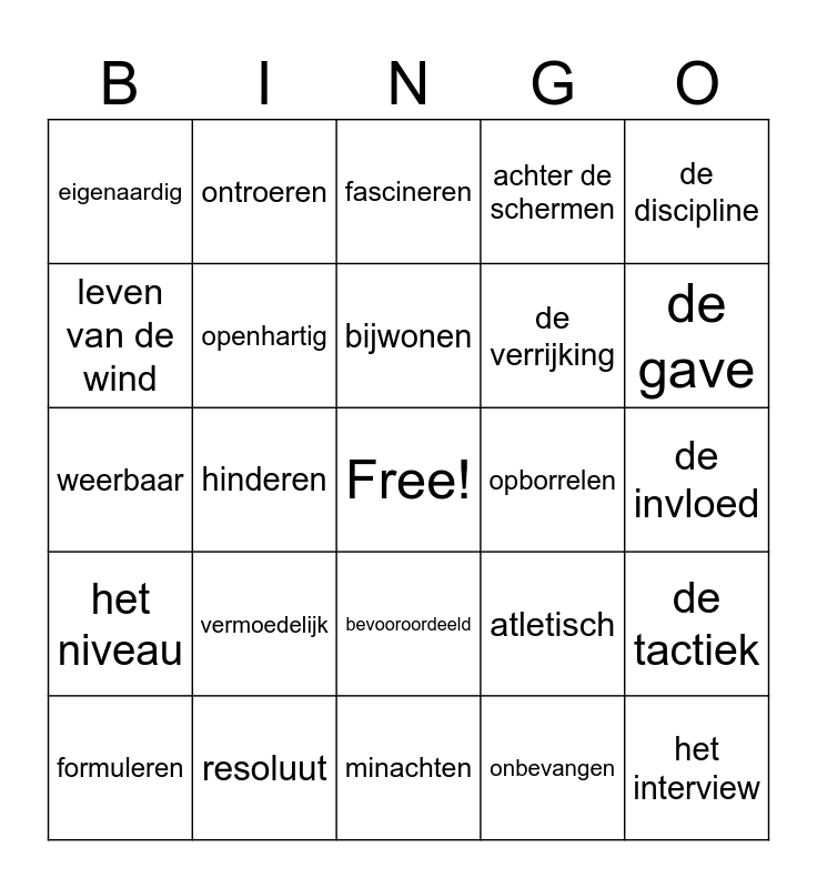 This bingo card has a free space and 44 words: respecteren, het interview, de geïnterviewde, formuleren, vastleggen, onbevangen, fascineren, veeleisend, de discipline, resoluut, achter de schermen, opborrelen, bevooroordeeld, vermoedelijk, de waardering, minachten, weerloos, weerbaar, afkomstig zijn, de gave, ontroeren, beamen, het interieur, eigenaardig, uiteraard, de invloed, de historie, het hemd van het lijf vragen, atletisch, het niveau, de beperking, de tactiek, indrukwekkend, allesbehalve, hinderen, de spijker op de kop slaan, je ogen de kost geven, de voldoening, bijwonen, leven van de wind, de verrijking, de verarming, openhartig and gesloten.