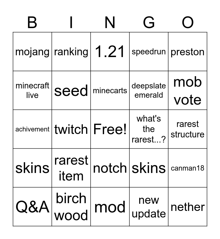 This bingo card has a free space and 24 words: rarest item, birch wood, minecarts, Q&A, preston, mojang, minecraft live, ranking, what's the rarest...?, notch, deepslate emerald, achivement, skins, canman18, seed, new update, rarest structure, 1.21, mob vote, twitch, nether, skins, speedrun and mod.