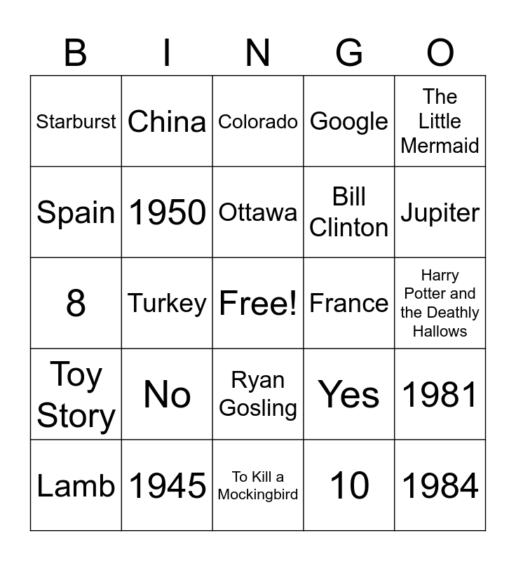 This bingo card has a free space and 33 words: Amazon, South Africa, Turkey, 3, Toy Story, 1950, The Little Mermaid, Lamb, China, Venus, Ottawa, Colorado, Walmart, Microsoft, France, Jupiter, 1945, 8, No, Yes, Ryan Gosling, Candy corn, Starburst, Harry Potter and the Deathly Hallows, To Kill a Mockingbird, 1984, Google, Bill Clinton, Spain, 1981, Captain Hook, 10 and PayPal.