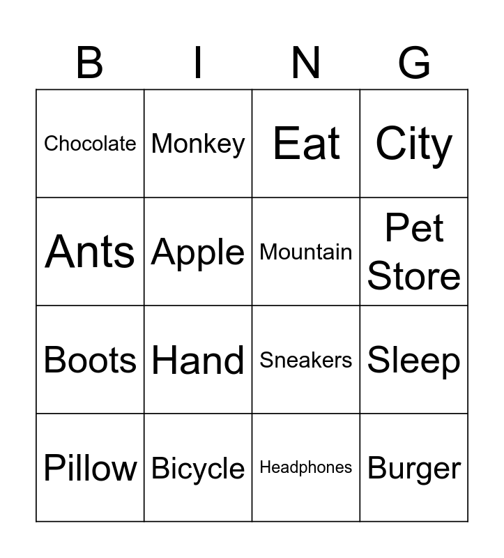This bingo card has 106 words: Flowers, Bees, Ants, Cry, Man, Woman, Kid, Girl, Boy, School, World, Rain, Sun, Star, Day, Night, Eat, Drink, Pencil, Numbers, Baby, Guitar, Water, Money, Eye, Mouth, Hand, City, Door, Math, Teacher, Doctor, Nurse, Video game, Clothes Store, Restaurant, Candy, Drug Store, Pet Store, Notebook, Music, Coffee, Cookies, Burger, Strawberry, Apple, Cherry, Chocolate, TV, Pillow, Chair, Bed, Crayons, Watermelon, Crocodile, Whale, Fish, Octopus, Hippo, Monkey, Snake, Drums, Window, Movie, Cat, Gift, Aiplane, Hat, Boots, Sneakers, Sleep, Balloon, Dog, Couch, Stroller, Chess, Shorts, Car, House, Musician, Computer, Photographer, Painter, Tree, Squirrel, Bird, Bicycle, Ice Cream, Ice Pop, Fork, Spoon, Person, People, Reading, Book, Listening, Writing, Mango, Kiwi, Headphones, Mountain, Cloud, Juice, Happy, Sad and Angry.