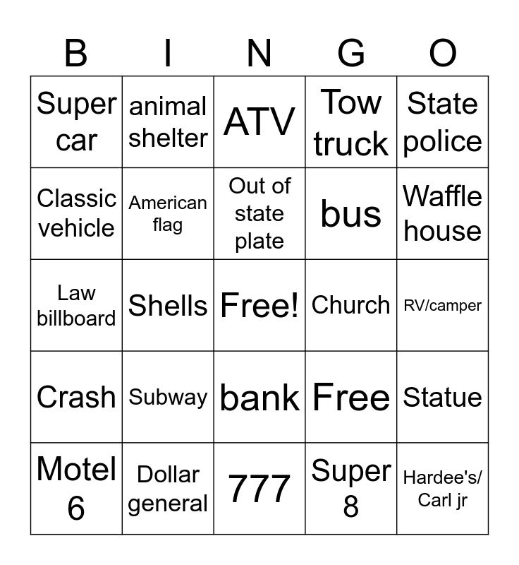 This bingo card has a free space and 25 words: Subway, 777, Out of state plate, Motel 6, State police, Super car, Classic vehicle, animal shelter, Church, bank, bus, Law billboard, Free, Statue, American flag, Porta potty, RV/camper, ATV, Waffle house, Shells, Hardee's/ Carl jr, Dollar general, Crash, Tow truck and Super 8.