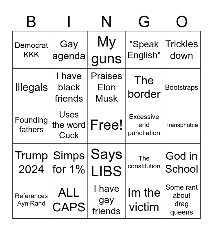 This bingo card has a free space and 24 words: Simps for 1%, ALL CAPS, Praises Elon Musk, References Ayn Rand, Trickles down, Democrat KKK, Illegals, Gay agenda, Excessive end punctiation, Says LIBS, The border, Founding fathers, The constitution, God in School, I have black friends, Im the victim, Transphobia, My guns, Bootstraps, Uses the word Cuck, Some rant about drag queens, Trump 2024, "Speak English" and I have gay friends.