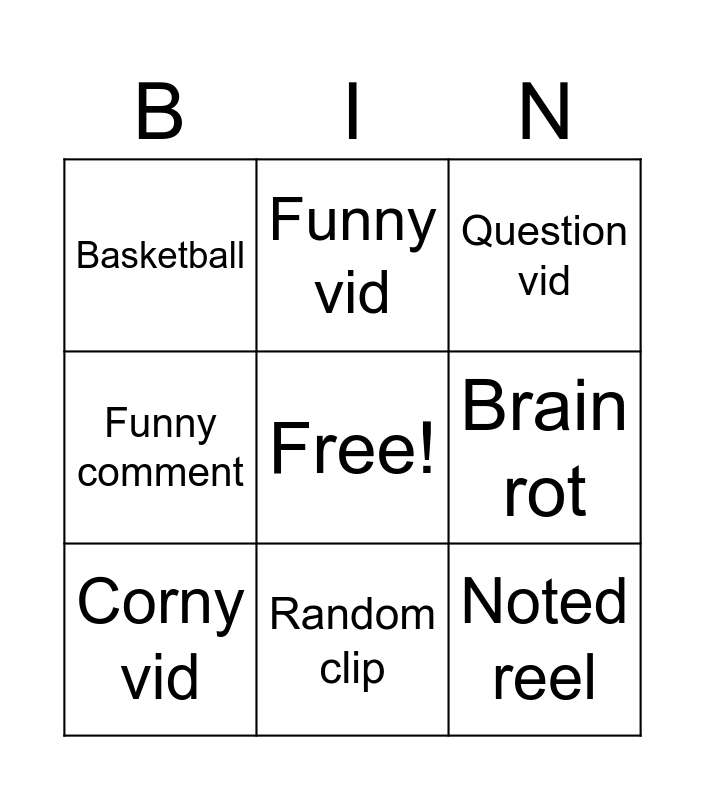 This bingo card has a free space and 8 words: Brain rot, Question vid, Funny vid, Corny vid, Basketball, Noted reel, Funny comment and Random clip.