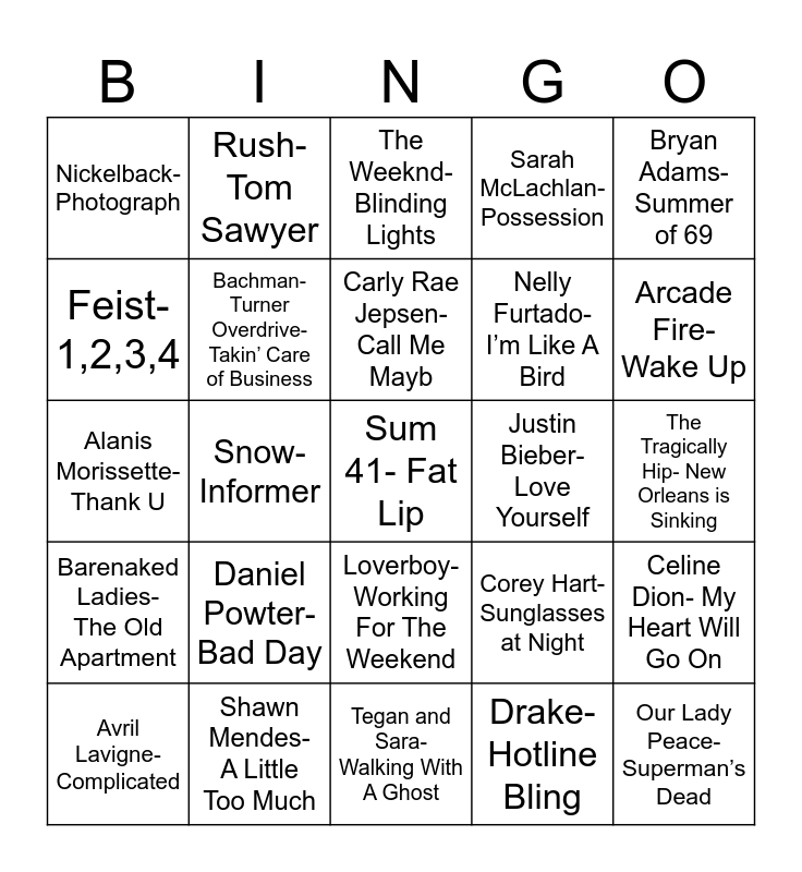 This bingo card has 28 words: Celine Dion- My Heart Will Go On, Shania Twain- When You Kiss Me, Nelly Furtado- I’m Like A Bird, Drake- Hotline Bling, Feist- 1,2,3,4, The Weeknd- Blinding Lights, Rush- Tom Sawyer, Barenaked Ladies- The Old Apartment, Justin Bieber- Love Yourself, Avril Lavigne- Complicated, Alanis Morissette- Thank U, Sarah McLachlan- Possession, Shawn Mendes- A Little Too Much, Tegan and Sara- Walking With A Ghost, Arcade Fire- Wake Up, Hot Hot Heat- Bandages, Daniel Powter- Bad Day, Bachman-Turner Overdrive- Takin’ Care of Business, Carly Rae Jepsen- Call Me Mayb, Loverboy- Working For The Weekend, Nickelback- Photograph, Our Lady Peace- Superman’s Dead, Sum 41- Fat Lip, Snow- Informer, The Tragically Hip- New Orleans is Sinking, Corey Hart- Sunglasses at Night, Bryan Adams- Summer of 69 and Neil Young- Rockin’ in the Free World.