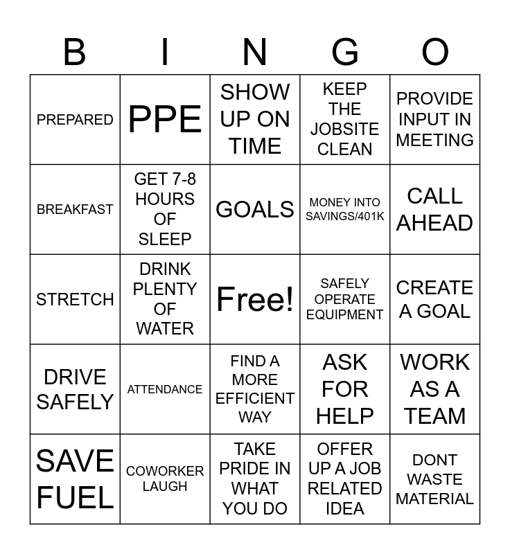 This bingo card has a free space and 24 words: ATTENDANCE, COWORKER LAUGH, GOALS, SAVE FUEL, PROVIDE INPUT IN MEETING, PREPARED, BREAKFAST, PPE, SAFELY OPERATE EQUIPMENT, FIND A MORE EFFICIENT WAY, MONEY INTO SAVINGS/401K, STRETCH, ASK FOR HELP, WORK AS A TEAM, GET 7-8 HOURS OF SLEEP, OFFER UP A JOB RELATED IDEA, CREATE A GOAL, SHOW UP ON TIME, CALL AHEAD, DRINK PLENTY OF WATER, DONT WASTE MATERIAL, DRIVE SAFELY, KEEP THE JOBSITE CLEAN and TAKE PRIDE IN WHAT YOU DO.