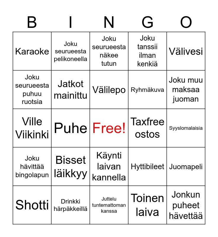 This bingo card has a free space and 24 words: Bisset läikkyy, Drinkki härpäkkeillä, Välilepo, Shotti, Välivesi, Karaoke, Joku seurueesta puhuu ruotsia, Joku seurueesta pelikoneella, Taxfree ostos, Käynti laivan kannella, Ryhmäkuva, Ville Viikinki, Hyttibileet, Juomapeli, Jatkot mainittu, Toinen laiva, Syyslomalaisia, Joku seurueesta näkee tutun, Joku muu maksaa juoman, Puhe, Jonkun puheet hävettää, Joku hävittää bingolapun, Joku tanssii ilman kenkiä and Juttelu tuntemattoman kanssa.