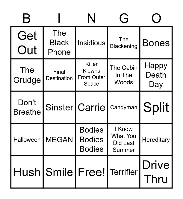 This bingo card has 25 words: Halloween, Smile, Carrie, Terrifier, Bones, Get Out, The Black Phone, Insidious, Candyman, Hereditary, The Grudge, Final Destination, Free!, I Know What You Did Last Summer, Happy Death Day, Hush, Sinster, Killer Klowns From Outer Space, The Cabin In The Woods, Split, Don't Breathe, MEGAN, Bodies Bodies Bodies, The Blackening and Drive Thru.