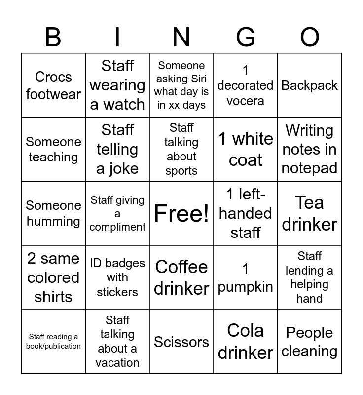 This bingo card has a free space and 24 words: ID badges with stickers, Staff talking about a vacation, Staff talking about sports, Staff reading a book/publication, Backpack, Crocs footwear, Someone teaching, Staff wearing a watch, 1 left-handed staff, Coffee drinker, 1 white coat, Someone humming, 1 pumpkin, Staff lending a helping hand, Staff telling a joke, Cola drinker, Tea drinker, Someone asking Siri what day is in xx days, Writing notes in notepad, Staff giving a compliment, People cleaning, 2 same colored shirts, 1 decorated vocera and Scissors.