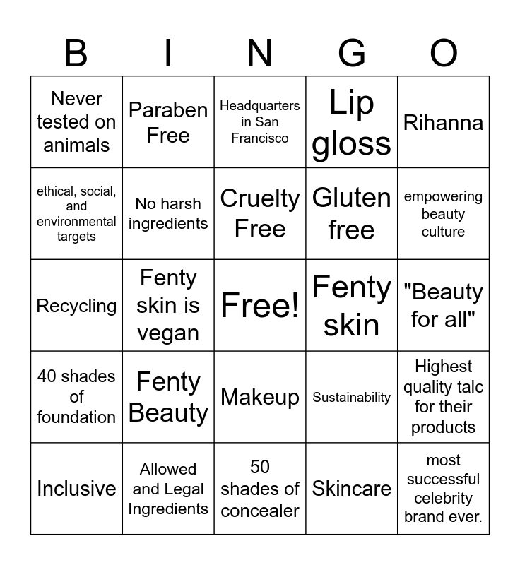 This bingo card has a free space and 24 words: Fenty Beauty, Allowed and Legal Ingredients, Cruelty Free, Inclusive, Rihanna, Never tested on animals, ethical, social, and environmental targets, Paraben Free, Fenty skin, Makeup, Gluten free, Recycling, Sustainability, Highest quality talc for their products, No harsh ingredients, Skincare, "Beauty for all", Headquarters in San Francisco, empowering beauty culture, Fenty skin is vegan, most successful celebrity brand ever., 40 shades of foundation, Lip gloss and 50 shades of concealer.