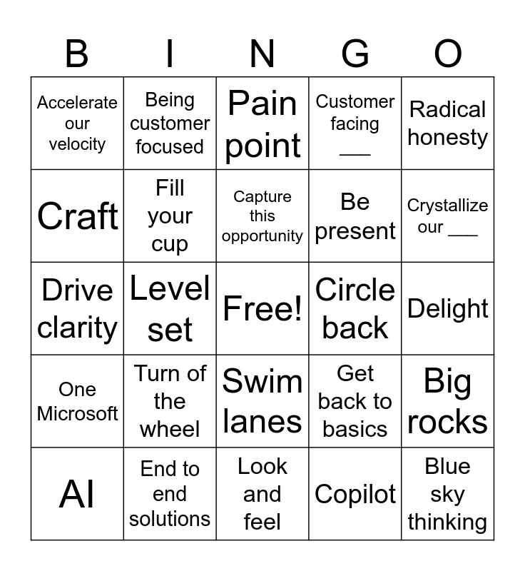 This bingo card has a free space and 29 words: AI, 1+1 =3, Level set, ___ mindset, Accelerate our velocity, Pain point, Fill your cup, Turn of the wheel, Circle back, End to end solutions, Delight, Blue sky thinking, Look and feel, Copilot, Crystallize our ___, Amplify our connection, Swim lanes, One Microsoft, Radical honesty, Drive clarity, Get back to basics, Bio break, Be present, Craft, Customer facing ___, Being customer focused, Big rocks, Capture this opportunity and Cross- discipline.