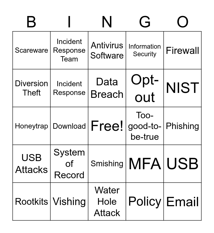 This bingo card has a free space and 75 words: Acceptable Use Policy, Adware, Antivirus Software, AOL, Attachments, Baiting, Broadband, Business Email Compromise, Computer Network, Credential Phishing, Cryptocurrency, Cryptolocker, Data Breach, Diversion Theft, DocuSign, Download, Dumpster Diving, Email, Email Address, Firewall, Gaining Access, Honeytrap, Incident Response, Incident Response Team, Information Security, Information Security Event, Information Security Incident, ISM, its-security@snhu.edu, Keyloggers, Links, MacAfee, Malware, MFA, NIST, Opt-out, Password manager, Phish Bowl, Phishing, Policy, Popup Message, Pretexting, Privacy, Quishing, RAM, Ransomware, Rootkits, Scareware, Security Operations Center, Sense of Urgency, SharePoint, Smishing, Social Engineering, Social Media, SPAM, Spear Phishing, Spoofing, Spyware, Standard, Subject Line, System of Record, Tailgating, The Cloud, The Internet, Threat Actor, Too-good-to-be-true, Trojan, Updates, URL, USB, USB Attacks, Vishing, WannaCry, Water Hole Attack and Worm.