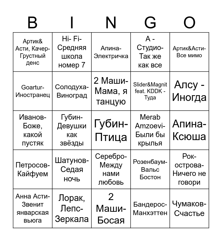 This bingo card has 25 words: Шатунов- Седая ночь, 2 Маши- Босая, 2 Маши- Мама, я танцую, Анна Асти- Звенит январская вьюга, Артик&Асти- Все мимо, Артик& Асти, Качер- Грустный денс, Goartur- Иностранец, Hi- Fi- Средняя школа номер 7, Merab Amzoevi- Были бы крылья, Серебро- Между нами любовь, Slider&Magnit feat. KDDK - Туда, Иванов- Боже, какой пустяк, Розенбаум- Вальс Бостон, Рок- острова- Ничего не говори, Солодуха- Виноград, Чумаков- Счастье, Апина- Ксюша, Апина- Электричка, Алсу - Иногда, Губин- Девушки как звёзды, Губин- Птица, Лорак, Лепс- Зеркала, Петросов- Кайфуем, А - Студио- Так же как все and Бандерос- Манхэттен.