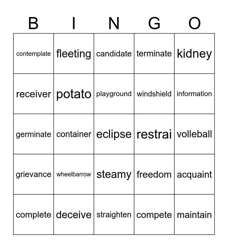 This bingo card has 25 words: wheelbarrow, straighten, playground, complete, kidney, contemplate, receiver, fleeting, restrai, steamy, windshield, germinate, freedom, acquaint, potato, maintain, volleball, candidate, information, container, eclipse, deceive, grievance, terminate and compete.