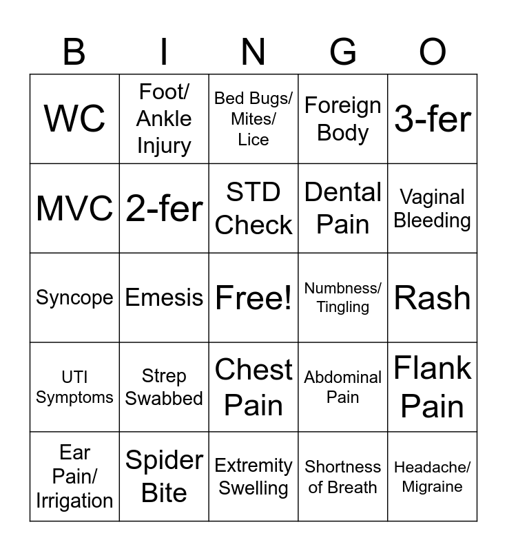 This bingo card has a free space and 32 words: Shortness of Breath, Toe Complaint, Emesis, Abscess, UTI Symptoms, 2-fer, 3-fer, Flank Pain, Foot/ Ankle Injury, Eye Complaint, STD Check, Bed Bugs/ Mites/ Lice, COVID Swabbed, Fall, Numbness/ Tingling, Laceration, Ear Pain/ Irrigation, Syncope, Chest Pain, Strep Swabbed, Abdominal Pain, Wrist/ Hand Injury, Rash, Spider Bite, Headache/ Migraine, Foreign Body, Dental Pain, MVC, WC, Extremity Swelling, Transfer and Vaginal Bleeding.