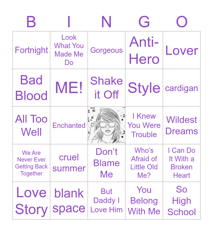 This bingo card has a free space and 24 words: cruel summer, blank space, Shake it Off, Love Story, Lover, Fortnight, Bad Blood, Look What You Made Me Do, I Knew You Were Trouble, Don’t Blame Me, Style, All Too Well, Who’s Afraid of Little Old Me?, I Can Do It With a Broken Heart, ME!, You Belong With Me, Wildest Dreams, Gorgeous, cardigan, Enchanted, So High School, We Are Never Ever Getting Back Together, Anti-Hero and But Daddy I Love Him.