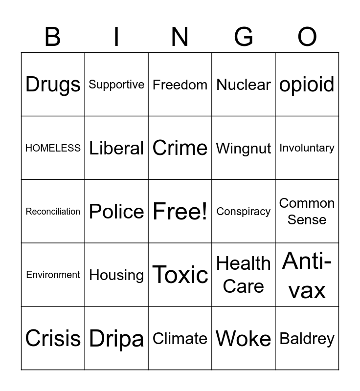 This bingo card has a free space and 24 words: Housing, Dripa, Crime, Crisis, opioid, Drugs, HOMELESS, Supportive, Conspiracy, Toxic, Wingnut, Reconciliation, Health Care, Anti-vax, Liberal, Woke, Common Sense, Freedom, Involuntary, Police, Baldrey, Environment, Nuclear and Climate.