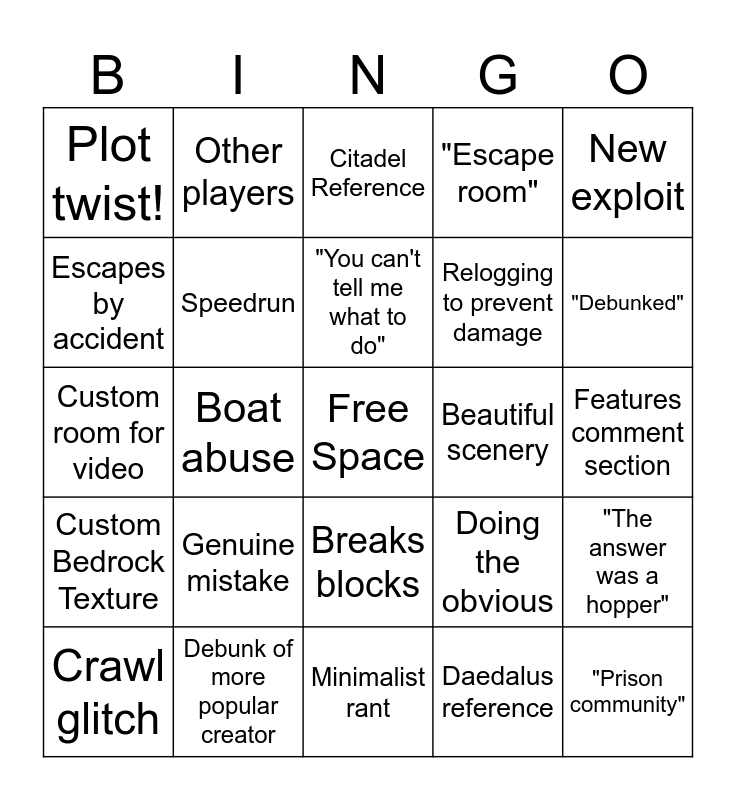 This bingo card has a free space and 34 words: "But then I had a very good idea", Daedalus reference, Wii Music, Escape Kits, Custom Bedrock Texture, Speedrun, New exploit, Crawl glitch, Other players, Faithful recreation, "You can't tell me what to do", Citadel Reference, SeenSven Reference, Other prison reference, Beautiful scenery, "Debunked", Debunk of more popular creator, Custom room for video, Genuine mistake, Doing the obvious, Breaks blocks, Conserve resources, Plot twist!, Features comment section, Minimalist rant, "Prison community", "Escape room", Enderpearls breaking everything, Relogging to prevent damage, Escapes by accident, Softlock moment, Boat abuse, "The answer was a hopper" and Water bucket abuse.