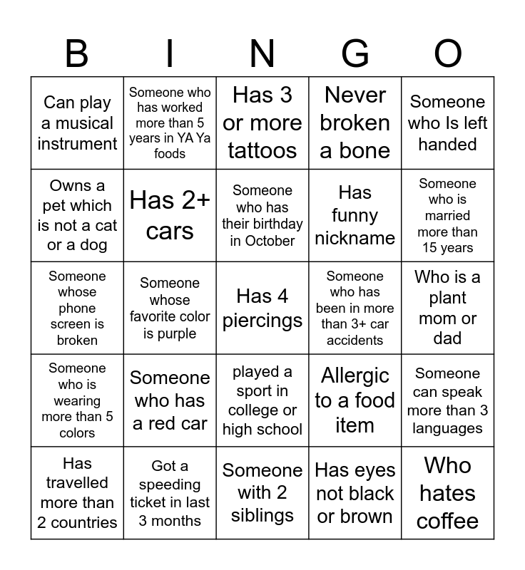 This bingo card has 25 words: Someone who has a red car, Someone with 2 siblings, Someone who has their birthday in October, Has travelled more than 2 countries, Someone who Is left handed, Can play a musical instrument, Owns a pet which is not a cat or a dog, Someone who has worked more than 5 years in YA Ya foods, Someone who has been in more than 3+ car accidents, played a sport in college or high school, Has funny nickname, Someone whose phone screen is broken, Allergic to a food item, Someone can speak more than 3 languages, Has 2+ cars, Who hates coffee, Who is a plant mom or dad, Has 3 or more tattoos, Someone who is married more than 15 years, Someone whose favorite color is purple, Has 4 piercings, Got a speeding ticket in last 3 months, Someone who is wearing more than 5 colors, Never broken a bone and Has eyes not black or brown.